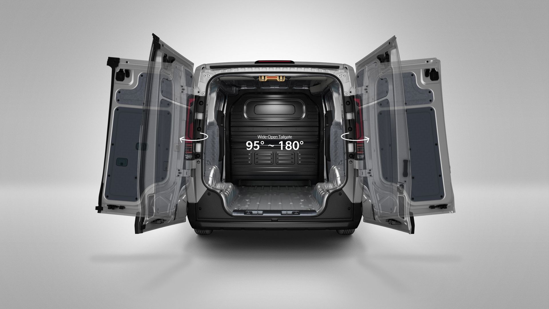Le porte posteriori a battente si aprono a 95° per soste rapide e fino a 180° per carichi pesanti. Con oltre 1.343 mm di apertura, due europallet entrano senza problemi.